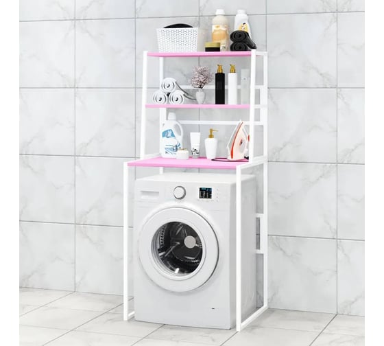Стеллаж для ванной, напольный стеллаж над стиральной машинкой Solarius белый металлический каркас, 3 розовые полки из массива сосны, 70x59,5x163,5 см stellaz3roz-white