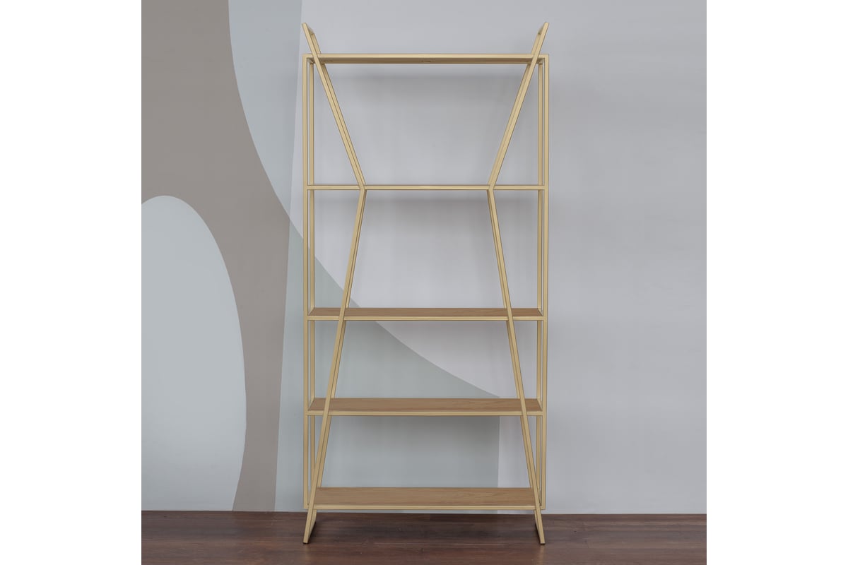 Золотой стеллаж OSLO MINI с полками из ЛДСП привлекает внимание уникальным дизайном и функциональностью. Оригинальная форма металлического каркаса добавит индустриального шика в интерьер гостиной, спальни, кабинета.