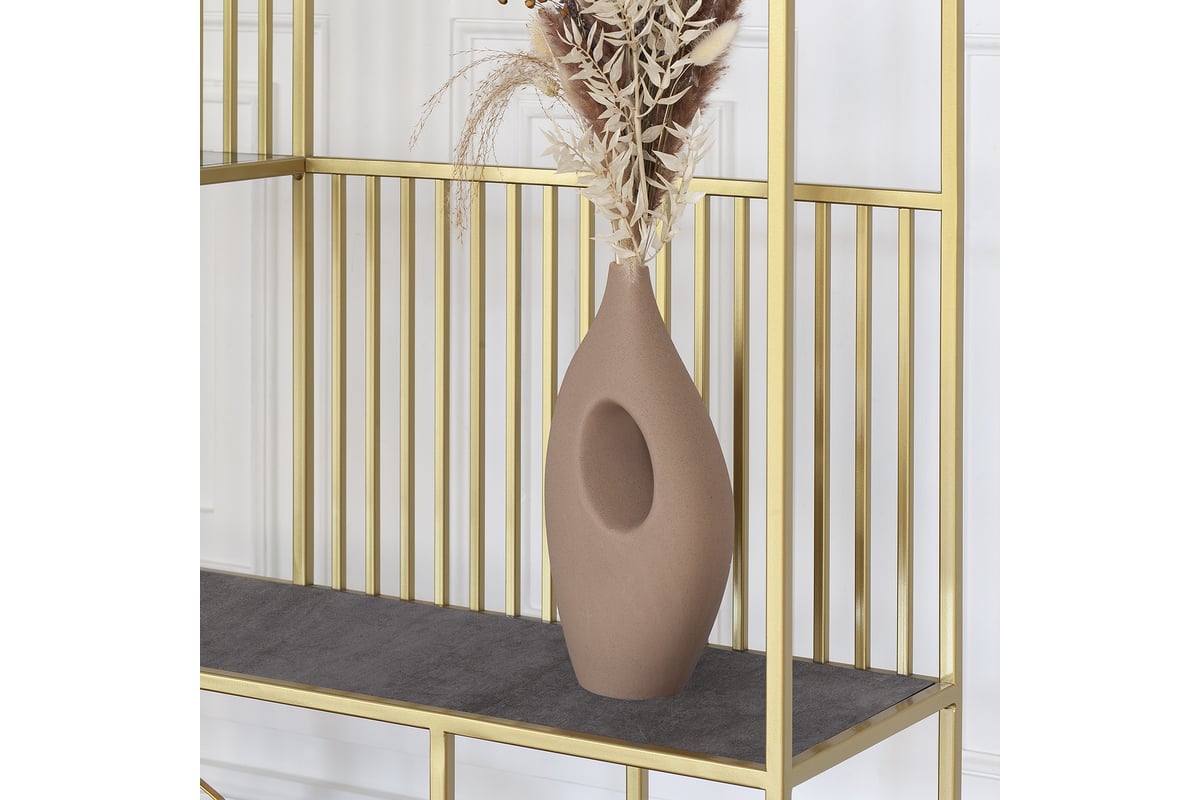 Золотой металлический стеллаж SOHO с керамическими полками привлекает внимание элегантным дизайном и функциональностью. Прочный стальной каркас изготовлен из профильных труб 15х15 и 10х10 мм, что обеспечивает надежность предмета интерьера. Вместительный стеллаж организует пространство в гостиной, спальне, кабинете, кухне и ванной комнате. Широкий стеллаж с открытыми полками удобно использовать в качестве перегородки для зонирования. На полках можно хранить книги, журналы, фотографии, игрушки, комнатные растения.