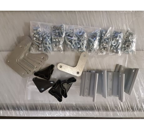 В комплекте 4 подпятника, 17 уголков (цинк), 8 пакетиков болтов с гайками (8 болтов, 8 гаек). На все полки хватает.