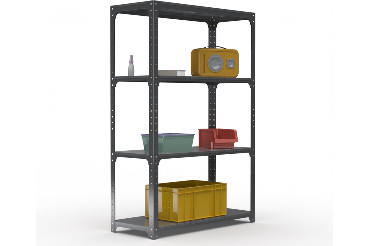 Стеллаж оснащен специальной перфорацией, которая позволяет изменять высоту полок по мере необходимости. Каждая стойка состоит из 2-х частей, такое решение обеспечивает удобство транспортировки и защищает стеллаж от повреждений. Полки на стеллажах серии KIT состоят из отдельных сегментов, за счет чего образуются поперечные ребра жесткости, что позволяет увеличить нагрузку на полку. Также сегментные полки позволяют хранить негабаритные вертикальные предметы (удочки, вазы, детские лыжи и.т.д)