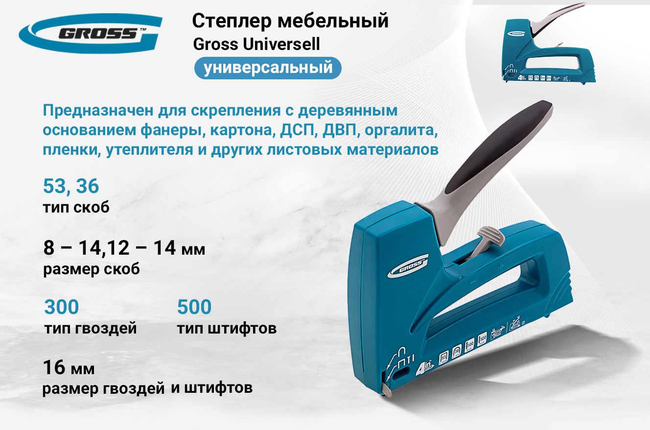 Пластиковый мебельный степлер Gross Universell 4 41005, 4-функциональный, — универсальный инструмент, совместимый со скобами типа 53 размером 8-14 м, 36 размером 12-14 мм, гвоздями типа 300 и штифтами типа 500 размером 16 мм. Предназначен для скрепления с деревянным основанием фанеры, картона, ДСП, ДВП, оргалита, пленки, утеплителя и других листовых материалов. Его используют для обивки мягкой мебели, сборки шкафов, монтажа низковольтных проводов, выполнения багетных и других крепежных работ.