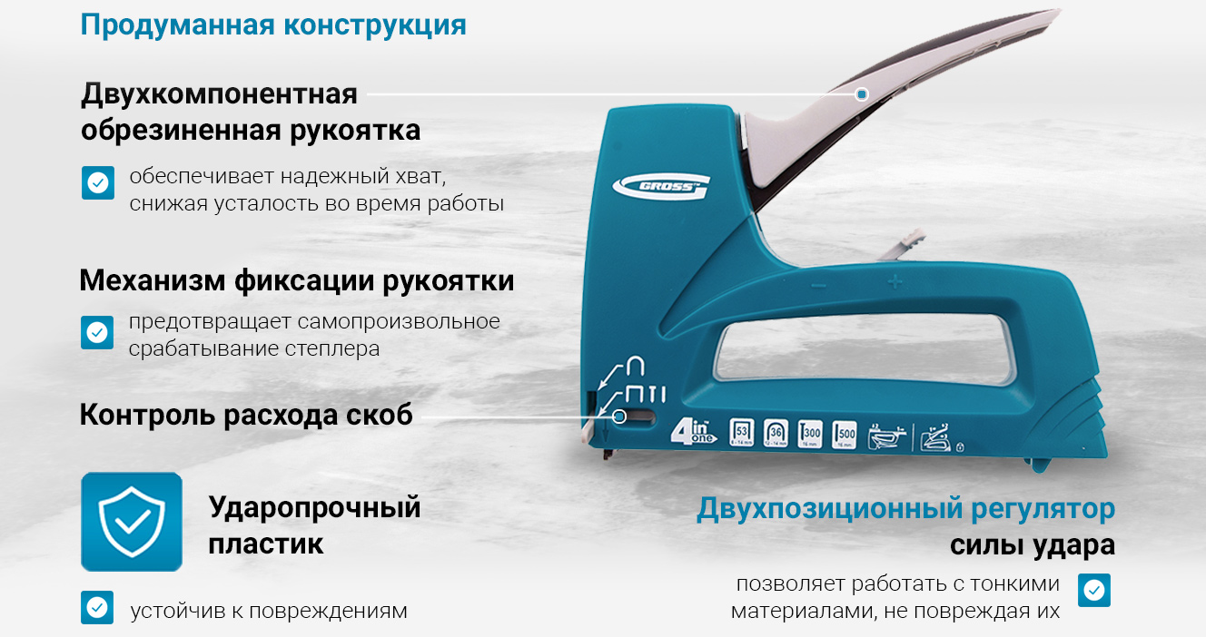 Простота пользования На степлере мебельном 4-функциональном GROSS 41005 есть изображения технических характеристик. |