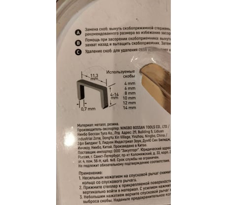 Работает на скобах 53 типа. Характеристики скоб: толщина 0,7мм, ширина 11,4мм, глубина от 4 до 14мм.