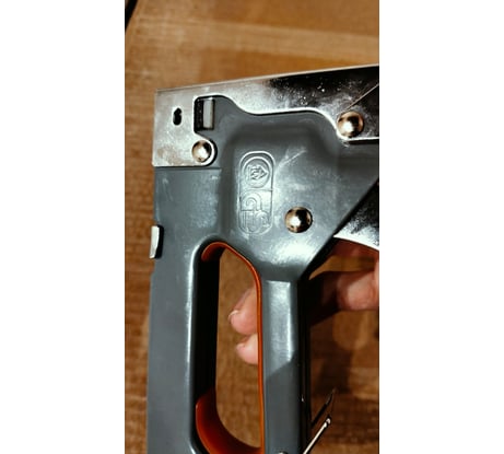 Нормальный степлер. Держать удобно, ручка проризинена внутри. Если плотно прижать к поверхности перед использованием, то скобы из материала потом еле вытащишь.