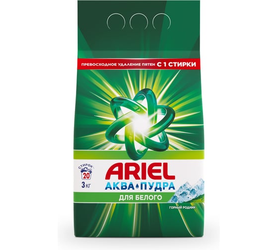 Стиральный порошок Ariel Горный родник для стиральной машины предназначен для стирки белого и цветного белья. Благодаря технологии Аквапудра, порошок для стирки Ariel Color растворяется, едва коснувшись воды, и моментально активируется: глубоко проникает в структуру волокон и удаляет сложные пятна, не давая загрязнениям въедаться.