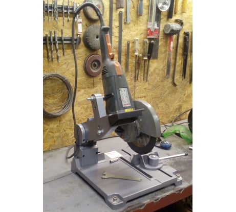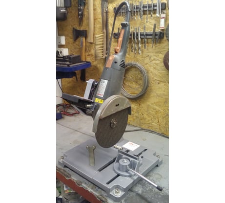 Приладил старенькую УШМ Rebir 230. Болты М14 в болгарку посадил на фиксатор резьбы, боковые упоры на гроверы. Кривовато встал нижний упор, но на функционировании не отражается. Есть небольшой люфт в шарнире, но больше всего на рез влияет увод диска. Взял луганские 230х1,6мм - все кривые и легко перекашиваются. Пробовал остаток dexter'а толщиной 2 мм - рез ровный. Зажим заготовки требует постоянного внимания: то зажат и не хочет перемещаться, то недожат и не держит заготовку. Угол изменяется в одну сторону, пришлось сверлить дополнительные отверстия и каждый раз переставлять болт. Зажим требует доработки. Для моих нерегулярных работ подходит.