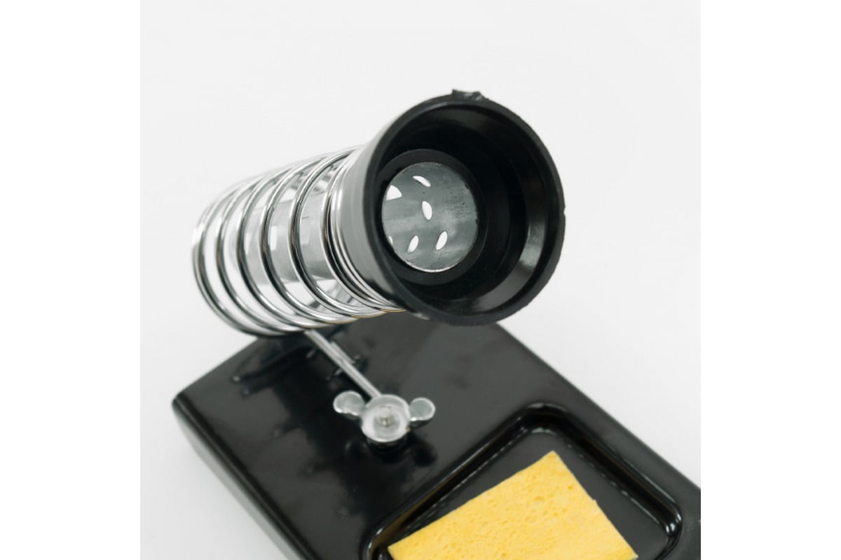 Стойка для паяльника Политех 9054654 используется для фиксации паяльника. Металлическое основание с ложементом под губку для очистки жала паяльника от остатков припоя с пружиной спиральной формы и пластиковым термостойким наконечником. Губка для очистки жала паяльника в комплекте. Паяльник легко и удобно помещается в направляющую.