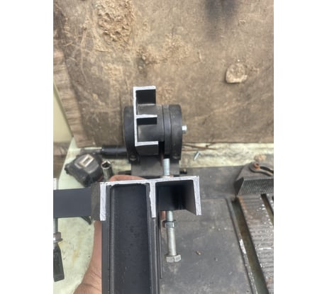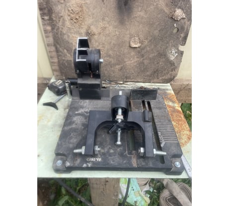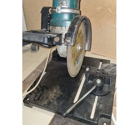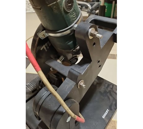 Крепление УШМ на этой станине штатными средства невозможна! Два упора в комплекте бесполезные. Верхний упор упирается в пластиковую часть корпуса, рычаг от точки крепления большой, здесь всё нормально. Но нижний упор бесполезен! Он упирается в УШМ под углом (в редуктор) и не способен её держать! Плюс рычаг от точки крепления около сантиметра, т.е. он вообще не держит её в этом месте.. Я заменил эти упоры на один держатель канализационных труб, он охватывает её, и крепко держит! Теперь по креплению в тех местах, где к УШМ прикручивается ручка. Крепление не позволяет регулировать положение УШМ относительно вертикальной оси. Когда я всё собрал, оказалось что диск расположен не параллельно плоскости реза, но отрегулировать это невозможно! Поэтому я сделал проточку в одном креплении, чтобы отверстие было продолговатым а не круглым, и позволяло передвигать одну ось.. В станине, напротив сделал отверстие, и из шпильки и куска полосы сделал регулятор положения под болт.. Фото прикладываю, должно быть понятно..