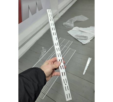 Стойки для монтажа кронштейнов располагаются на несущем рельсе и крепятся к стене. На стойке имеется два ряда пазов для крепления специальных кронштейнов под полки и перекладины. Порошковое полимерное покрытие белого цвета