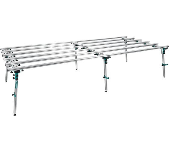 KRAFTOOL TTL-360 Стол для раскроя и работы с крупноформатной плиткой 360x150x70 см 33253-360 имеет быстросборную конструкцию и сумку для переноски, чтобы максимально удобно начинать работу с плиткой. Облегченный алюминий не прогибается под максимальной нагрузкой (250 кг). Упоры для плитки позволят ставить плитку, или подвешивать инструмент. Ножки имеют возможность регулировки на неровной поверхности.