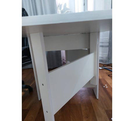 Криво накернены детали(если собирать данную модель по керну(отметинах) в деталях-то будут лютые зазоры на столешнице), что усложняет сборку стола. Тоже самое по всем петлям. Сам материал очень хороший, сколов , вмятин нет. Запакован товар хорошо, даже при условии того, что товар выдали в коробке с разорваным одним углом, внутри все целое.