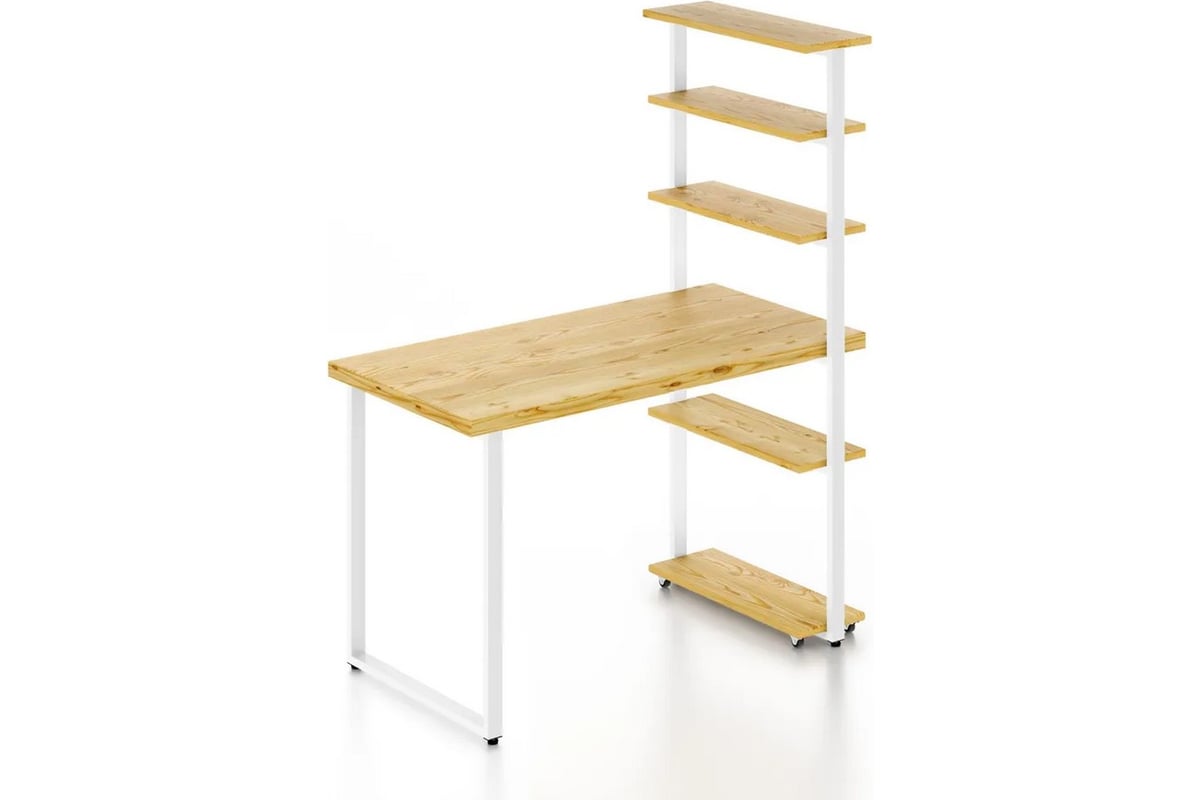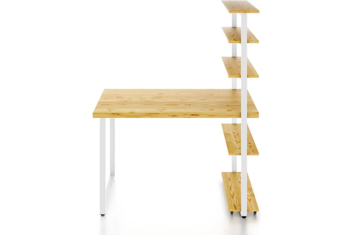 Стол компьютерный Solarius Loft с пятью полками, столешница без покраски из массива сосны 40 мм и белые металлические ножки, 110x60x145 см stol-comp11060-white