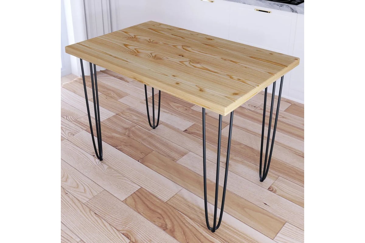 Стол кухонный Solarius Loft со столешницей без покраски из массива сосны 40 мм на черных металлических ножках-шпильках, 90x60x75 см 710-10153