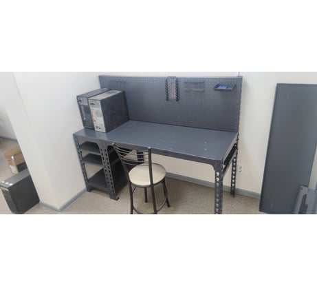 Конструкция имеет прочные опоры из углового профиля. Специальная перфорация позволяет изменить высоту полок. Столешница выполнена из прочного листового металла и выдерживает значительные нагрузки.