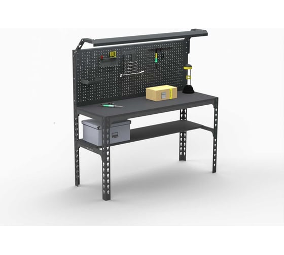 Металлический стол с (одна полка + перфопанель с комплектом освещения) предназначен для удобной организации отдельного рабочего места на производствах, складах, гаражах, мастерских, и на других объектах. Модель оснащена светодиодным комплектом освещения. Обеспечивает комфортную работу пользователя. Используется в качестве дополнительного оборудования. Перфопанель с комплектом аксессуаров является дополнительный элементом, который увеличивает рабочее пространство и структурирует хранение инструмента. Толщина перфопанели 0.8 мм. Крепление перфопанели: болтовое.На панели легко разместить дополнительные аксессуары – ключи, лотки, держатели и так далее. Перфопанель имеет отверстия двух видов: первый под аксессуары производства ООО Металекс; второй под стандартные аксессуары с круглым креплением.