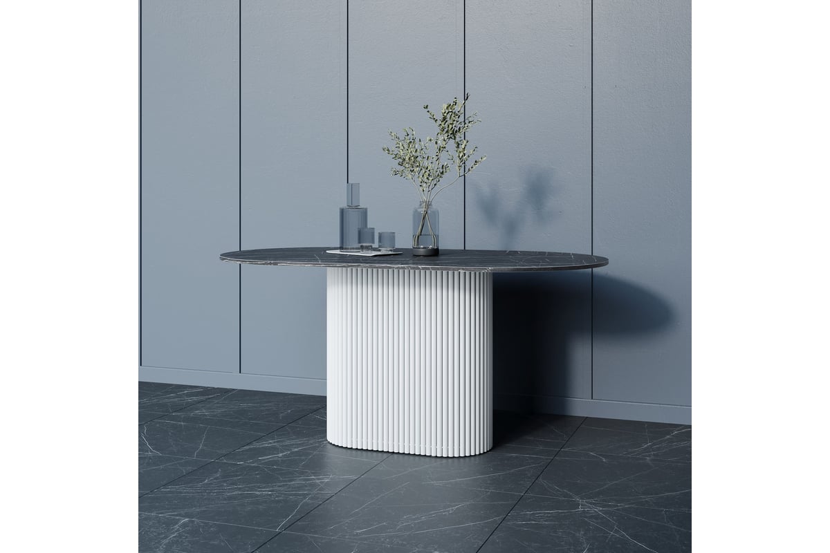 Стол овальный обеденный GENGLASS с белым металлическим подстольем и столешницей черный мрамор TRUBIS Wood, 1600х900х750 мм GGT-03-3-4-O-16080