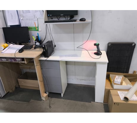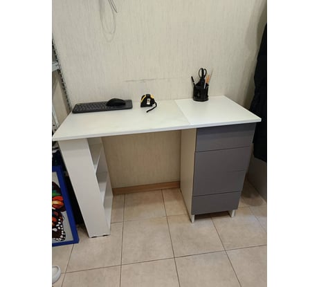 Вполне функциональный столик. Именно столик, потому что он малогабаритный, при стандартной высоте столешница всего лишь 450 мм, не обратил внимания на этот размер. Была бы хотя бы 600 мм, для меня бы было самое то. ВНа фото соседний столик приподняли, т.к у него выдвижная полочка для клавиатуры расположена слишком низко. сборке удобен, все места для шурупов накернены, надо только сориентироваться, как правильно прикрепить к боковинам направляющие ящиков, т.к. есть разница при выборе места их расположения (справа или слева).