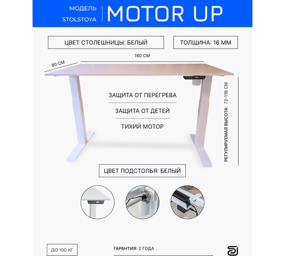 Стол с регулируемой высотой StolStoya МОТОР UP рама белая, столешница ЛДСП, белая, 145x80 PE211IWSLB145 является базовым в линейке столов для чередования работы стоя сидя. Обладает значительно более высокими характеристиками, нежели у аналогов на рынке.