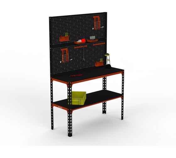 Стол-верстак подойдет для небольшой мастерской или производственного помещения. Двойная перфопанель с комплектом аксессуаров является дополнительный элементом для стола - верстака, который увеличивает рабочее пространство и структурирует хранение инструмента. Перфопанель изготовлена из стали толщиной 0.8 мм. Крепление панели: болтовое. Стол-верстак выполнен из стали толщиной 1,5 мм. Предназначен для удобной организации отдельного рабочего места на производствах, складах, гаражах, мастерских, и на других объектах. Максимум распределённой нагрузки на весь верстак составляет - до 350 кг. Максимум распределённой нагрузки на полку составляет - до 100 кг. Крепление стола: безболтовое. Цвет: оранжево-черный.