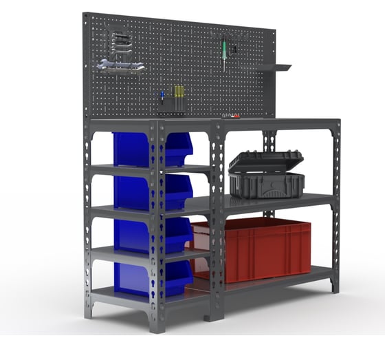 Столешница выполнена из прочного листового металла толщиной 1.5 мм и выдерживает значительные нагрузки. Изделие обеспечивает рациональное хранение различных предметов на полках. В комплектацию входит: перфопанель и набор аксессуаров.