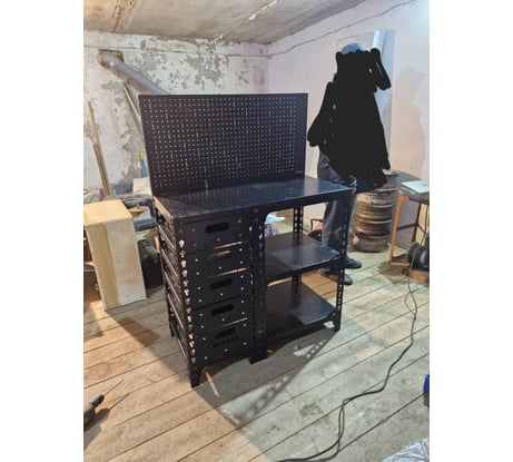 Стол-верстак c одной тумбой + перфопанель с комплектом аксессуаров (чёрный) подойдет для небольшой мастерской или производственного помещения. Помимо самой столешницы имеется: 2 полки, 1 перфопанель, комплект аксессуаров и 5 ящиков для рационального хранение различных предметов (мелких деталей, документации, инструментов). Используется для организации рабочих мест на производствах, на складах, в гаражах, мастерских, автосервисах и на других объектах. Предназначен для слесарных и сборочных работ. Крепление: комбинированное. Не используются шарико-телескопические направляющие, ящики выдвигаются на основе металлических направляющих толщиной 2 мм, что позволяет увеличить нагрузку на ящики и их долговечность.Перфопанель с комплектом аксессуаров является дополнительный элементом для стола - верстака, который увеличивает рабочее пространство и структурирует хранение инструмента. Перфопанель изготовлена из стали толщиной 0.8 мм. Крепление панели: болтовое. Стол-верстак выполнен из стали толщиной 1,5 мм. Максимум распределённой нагрузки на весь верстак составляет - до 350 кг. Максимум распределённой нагрузки на полку составляет - до 100 кг. Крепление стола: безболтовое. Цвет: черный