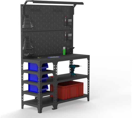 Верстак предназначен для удобной организации отдельного рабочего места на производствах, складах, гаражах, мастерских, и на других объектах. Модель оснащена комплектом освещения, который обеспечивает комфортную работу пользователя. Используется в качестве дополнительного оборудования для верстаков. Модель оснащена прочными опорами из углового профиля. Имеется специальная перфорация, при помощи которой можно менять положение полок. Стол-верстак выполнен: - Столешница и полки из стали толщиной 1,5 мм; - Траверсы и стойки из стали толщиной - 2 мм; -Перфопанель -0,8 мм. Можно использовать в столярных и слесарных мастерских. Изделие обеспечивает рациональное хранение различных предметов на полках. Максимум распределённой нагрузки на весь верстак составляет до 350 кг. Максимум распределённой нагрузки на полку составляет до 100 кг. Крепление безболтовое. Цвет: серый.