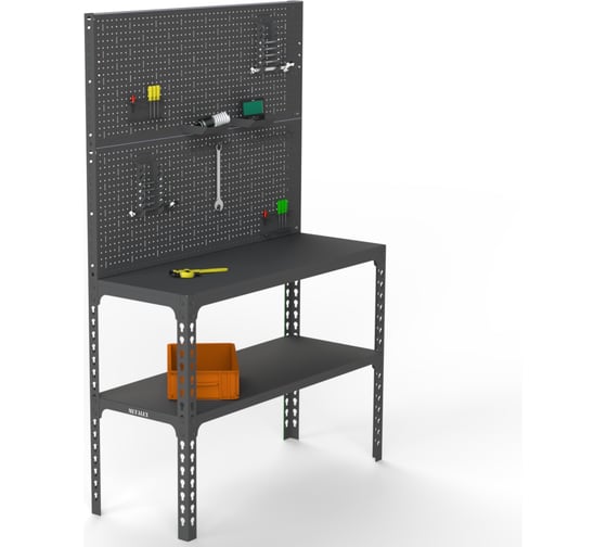 Стол-верстак Metalex 950x1500x400 (одна полка) + двойная перфопанель с комплектом аксессуаров (серый) / 111765.Стол-верстак — идеальное решение для небольшой мастерской или производственного помещения, обеспечивающее удобство и функциональность. Этот надежный и прочный верстак выполнен из стали толщиной 1,5 мм, что гарантирует его долговечность и устойчивость к нагрузкам. Максимально допустимая распределенная нагрузка на весь верстак составляет до 350 кг, а на полку — до 100 кг, что позволяет использовать его для самых различных задач.