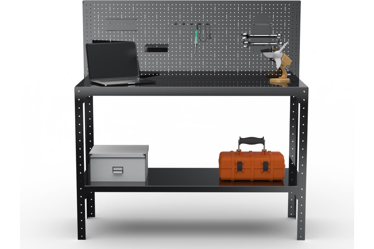 В комплект входит перфопанель с набором аксессуаров, что позволяет удобно размещать инструменты и материалы, обеспечивая легкий доступ к ним.