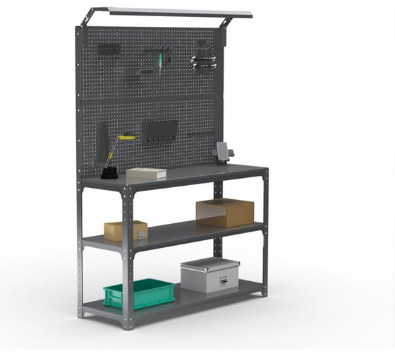 Две полки позволяют удобно хранить инструменты и материалы, а двойная перфопанель с комплектом освещения способствует улучшению видимости и упрощает доступ к необходимым инструментам.