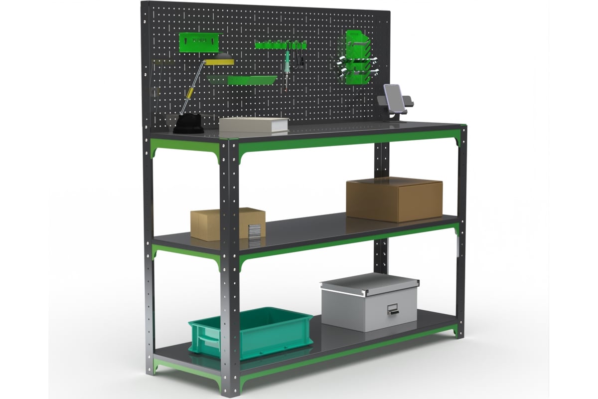 Вопросы и ответы о столе-верстаке ООО Металекс серия KIT 950х1100х600 мм, две полки + перфопанель с комплектом аксессуаров, серо-зеленый