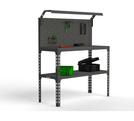 Стол-верстак Metalex серия SUN (одна полка + перфопанель с комплектом освещения) серый подойдет для небольшой мастерской или производственного помещения. Модель оснащена светодиодным комплектом освещения, который обеспечивает комфортную работу пользователя. Перфопанель с комплектом аксессуаров является дополнительный элементом для стола - верстака, который увеличивает рабочее пространство и структурирует хранение инструмента. Перфопанель изготовлена из стали толщиной 0.8 мм. Крепление панели: болтовое. Стол-верстак выполнен из стали толщиной 1,5 мм. Предназначен для удобной организации отдельного рабочего места на производствах, складах, гаражах, мастерских, и на других объектах. Максимум распределённой нагрузки на весь верстак составляет - до 350 кг. Максимум распределённой нагрузки на полку составляет - до 100 кг. Крепление стола: безболтовое. Цвет серый.