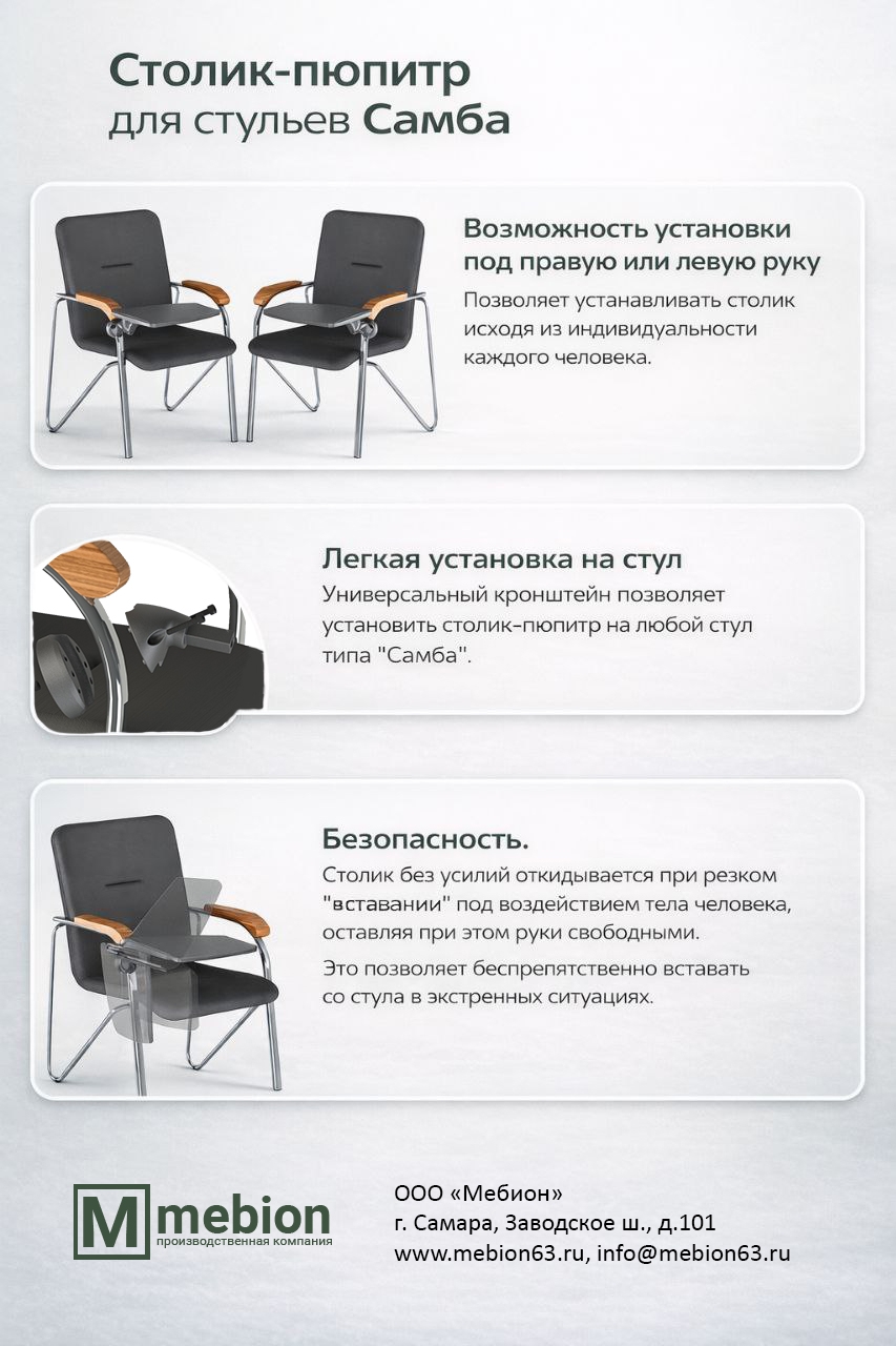 Универсальный кронштейн позволяет установить столик-пюпитр СПП-1 на любой стул и кресло типа "Самба". Стулья и кресла со столиком рекомендуется использовать в конференц-залах для проведения лекций, совещаний, семинаров и других подобных мероприятий. Конструкция столика предусматривает возможность поворота в двух плоскостях.