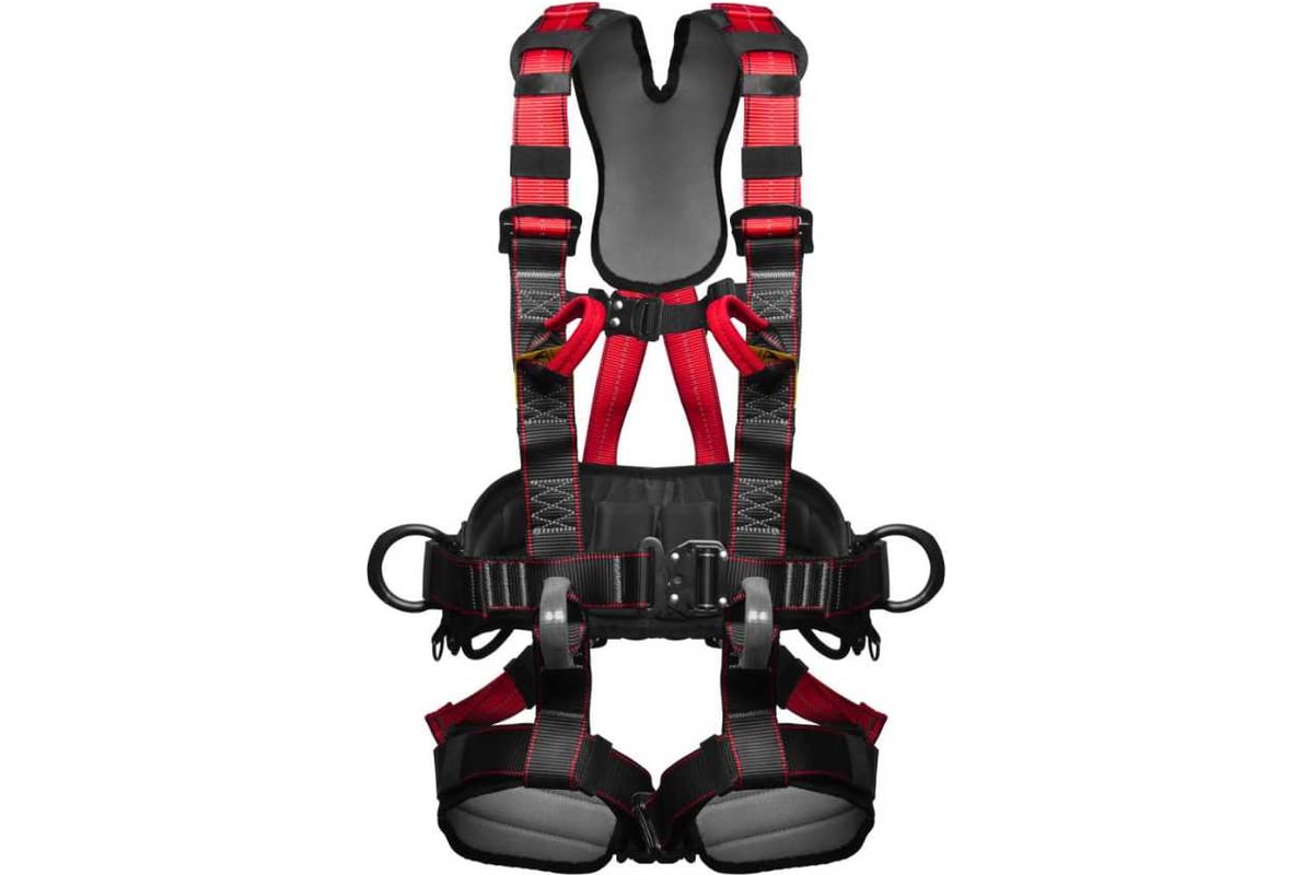 Верхние и нижние лямки имеют различные цвета (красно-черный), что помогает правильно надевать привязь.