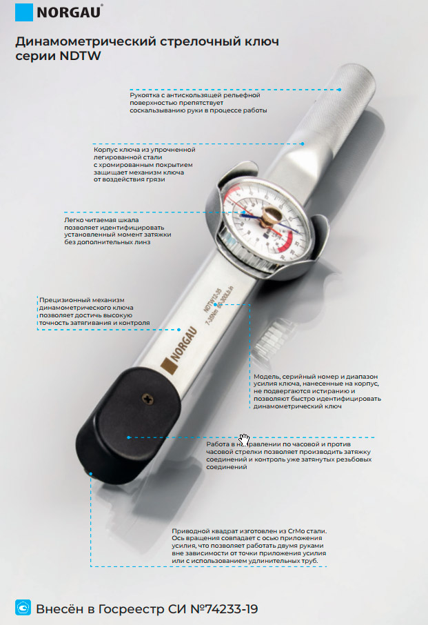 Стрелочный динамометрический ключ NORGAU 1/2" 40-200 Нм тип NDTW13-200 051117026