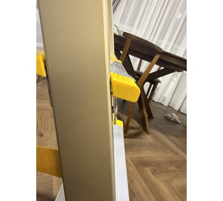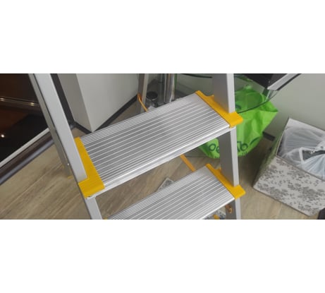 Тетива, площадка и ступени стремянки сделаны из алюминиевого сплава, задняя и передняя ноги – из анодированного профиля. Материал устойчив к коррозии, поверхность не темнеет, легко очищается и не пачкает руки. Толщина профиля на передней дуге – 50×20 мм, на задней дуге – 40×20 мм. На башмаках из толстого качественного пластика не образуются трещины. Широкие рифленые ступени помогают безопасно подниматься и спускаться по стремянке. Защитные стропы не дают стремянке разъезжаться.