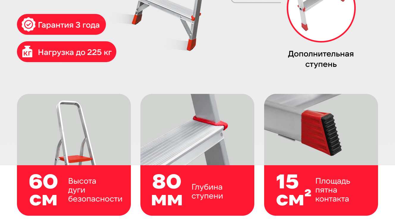 Стремянка способна помочь профессионалу в решении его задач. Отличается небольшим весом и усиленной конструкцией. Большая площадка обеспечивает комфортную работу. Клепальное соединение ступеней с профилем обеспечивает прочность и надежность стремянки. Чтобы не допустить скольжения ножек по полу, на них закреплены специальные пластиковые наконечники.