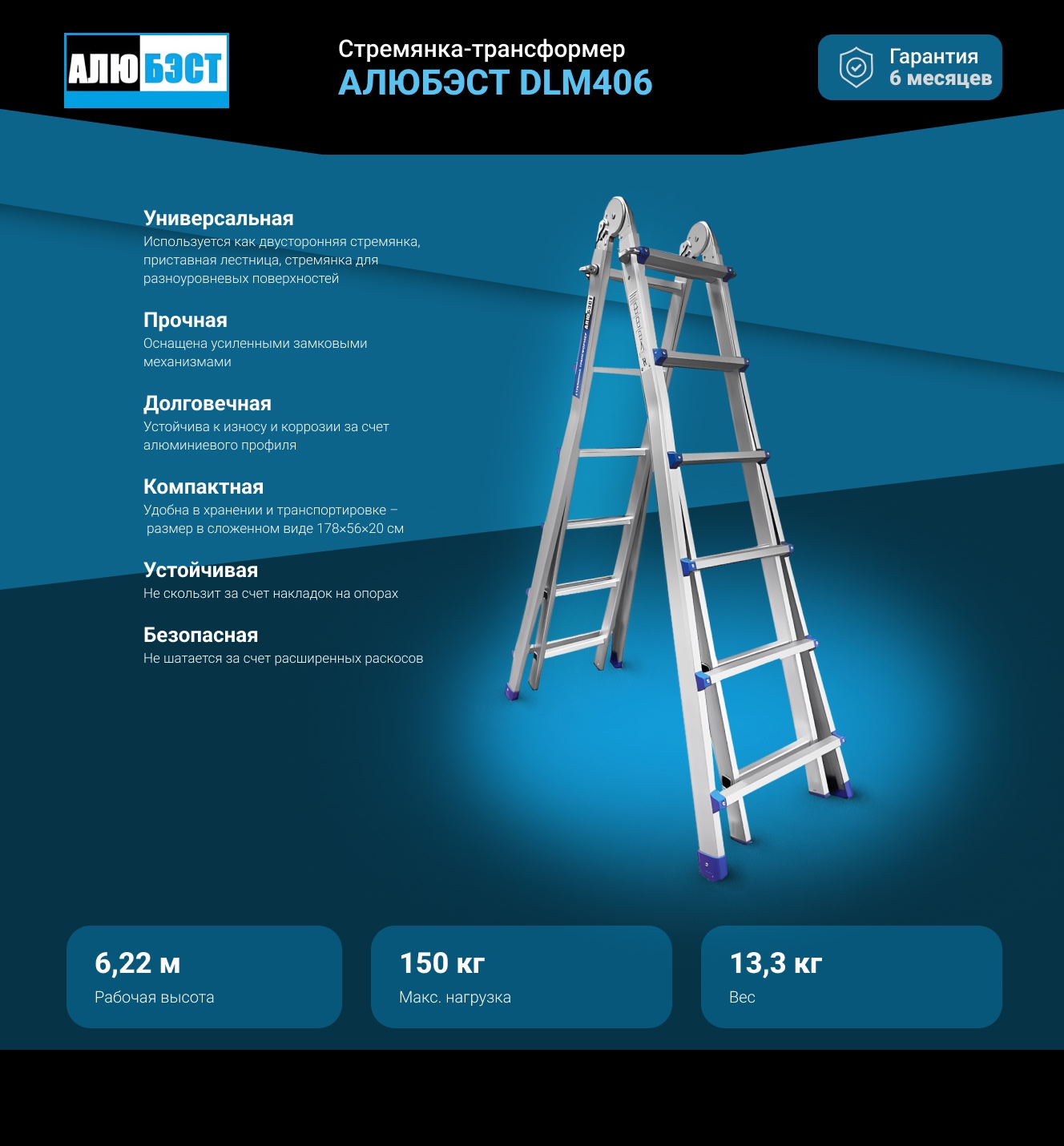 Стремянка-трансформер АЛЮБЭСТ 622 см DLM406 подходит для строительства и ремонта на профессиональном уровне, а также для бытовых работ.