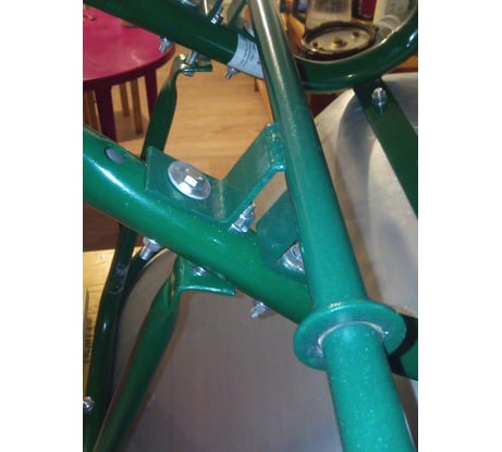 Думал про отверстия преувеличивают - действительно чтобы закрепить к раме ось пришлось сверлить новые отверстия т. к. вследствие кривизны рамы в штатные невозможно установить, плюс штатные отверстия получаются по диагонали - на разном расстоянии от ножек.