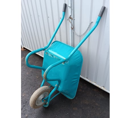 Тачка прочная, каркас жёсткий, сварка аккуратная. Колесо широкое, по грунту идёт уверенно, не заваливается.