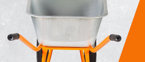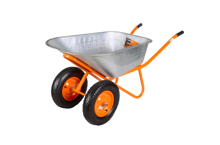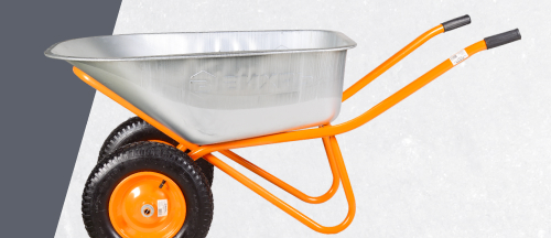 Конструкция тачки максимально продумана для удобного и длительного использования. Кузов изготовлен из металла толщиной 0,8 мм и имеет объем 110 л. Пологий угол наклона облегчает выгрузку песка и других материалов, прямые борта исключают просыпание во время транспортировки. Оцинкованная сталь, из которой сделан кузов, не боится коррозии, механических воздействий, не нуждается в покраске. Кузов установлен на металлическую раму с ручками, покрытыми прорезиненным нескользящим материалом, 2 опорами для надежной фиксации тачки и 2 колесами. Строительная тачка весит 14,28 кг, но благодаря мощным колесам работать с ней легко и комфортно. Наличие 2 пневматических колес 4.80-8, 380 с подшипниками обеспечивает плавность и бесшумность движения, облегчает перевозку тяжелых материалов. Подшипники из прочного износостойкого материала увеличивают срок службы колес и самой конструкции.