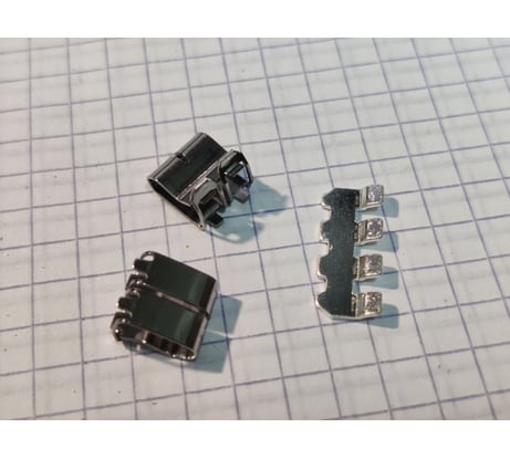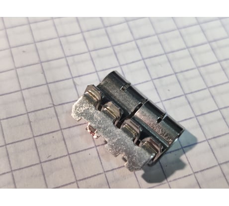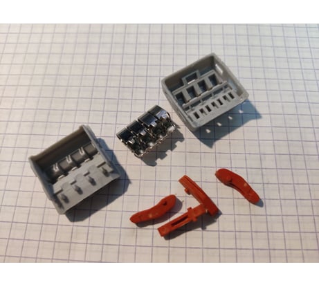 Внутри две парных пружинных зажима из стали и медная соединительная пластина толщиной 0,8 мм и шириной 3 мм в узкой части. Длина участка, контактирующего с проводом - примерно 4,75 мм. Учитывая, что для одиночного провода сечением 2,5 мм ПУЭ предписывает допустимый длительный ток 30 А, конструкция выглядит примерно соответствующей номинальному току 32 А. С другой стороны, чтобы обеспечить качественный контакт на соединении, ширина контакта дожна составить 0,5 мм. Корпус собран на 4 широких защёлках (по 2 по бокам) и 4 маленьких защёлках (под рычажками). Раскрыть было сложно, само развалиться не должно. Литьё пластика точное, наплывов нет. Ось вращения рычажков, конечно, миниатюрная, но, учитывая, что она работает только при раскрытии пружинного зажима, проблемой это быть не должно.