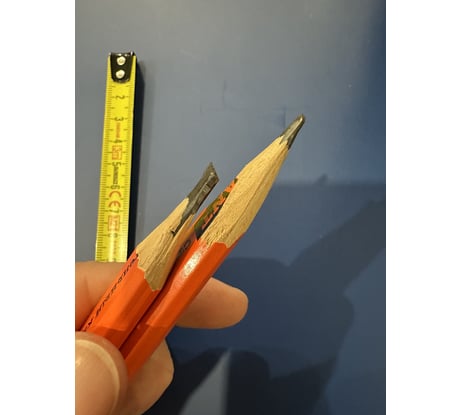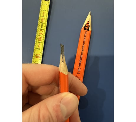 Обычный строительный карандаш, взял чисто чтобы был, потом ещё ни раз пригодится. Не первый раз такой беру, очень удобный, плоский, поэтому никуда не укатится. Грифель твёрдый, не ломкий, по кирпичу можно делать разметку не боясь что сломается.