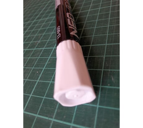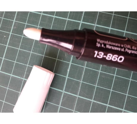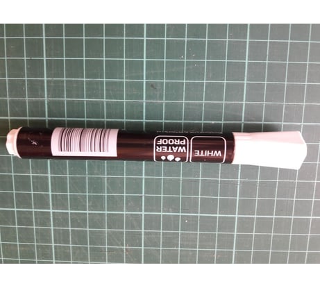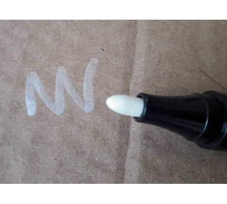 Обычный белый маркер. Брал для замазывания дефектов на белом пластике. Чтобы насыщенную белую линию получить, как на фото в карточке товара - надо несколько раз провести маркером.