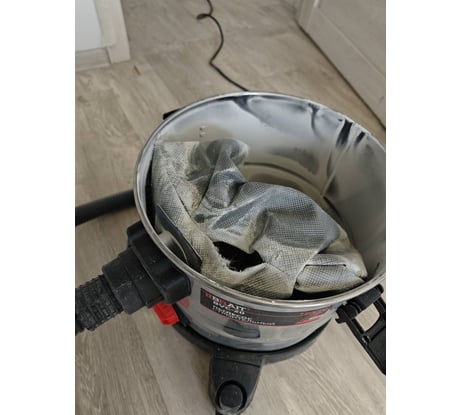Видно, что аппарат не из премьер-лиги, но за эту цену вполне. Мощность всасывания не поражает воображение, но чего хотеть от 1400Вт? На практике хорошо собирает строительную пыль и камушки средне-мелкого калибра. Для крупной фракции существует совок и веник, циклон на крайний случай. Есть резиновый переходник для стыковки с электроинструментом. На мой взгляд, главный недостаток это штатный мешок-пылесборник, а точнее его бестолковый пластиковый зажим. Куцая заходная фаска сделана только с одной стороны, и увидел я её слишком поздно. Привыкши к продуманным изделиям известных брендов, я энергично засунул мешок в прорезь, и удивительно легко порвал его острым краем. Ладно, сам виноват. Плохо другое, что этот пластиковый зажим не держит мешок. Давлением воздуха мешок раздувает, он потихоньку освобождается из зажима и мелкая строительная пыль устраивает "бурю в пустыне" внутри пылесоса. Естественно, часть пыли попадает в выпуск и разлетается обратно по помещению. Вот такой круговорот пыли от непримиримого борца с этой пылью. Купил одноразовые мешки в другом месте. Тут другая напасть. Мешки широкие, но не высокие, фактически висят в пылесосе. Наполняясь пылью, мешок тяжелеет и грузно опускается на дно пылесоса, вытаскивая себя из входной горловины. Нужен пенопластовый кружок на дно, или что-то похожее. В общем, мешок это слабое место в целом неплохого аппарата. А сетевой кабель такой толстый, что сварочный аппарат позавидует.