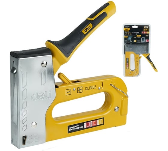 Строительный степлер усиленный 3-в-1 Deli DL1315Z Мощный и универсальный инструмент для крепления скоб, гвоздей и шпилек в дерево, пластик, ткань и другие материалы Идеален для профессионалов и домашних мастеров — обивка мебели, монтаж плинтусов, гипсокартона, утеплителя, каркасов и отделки