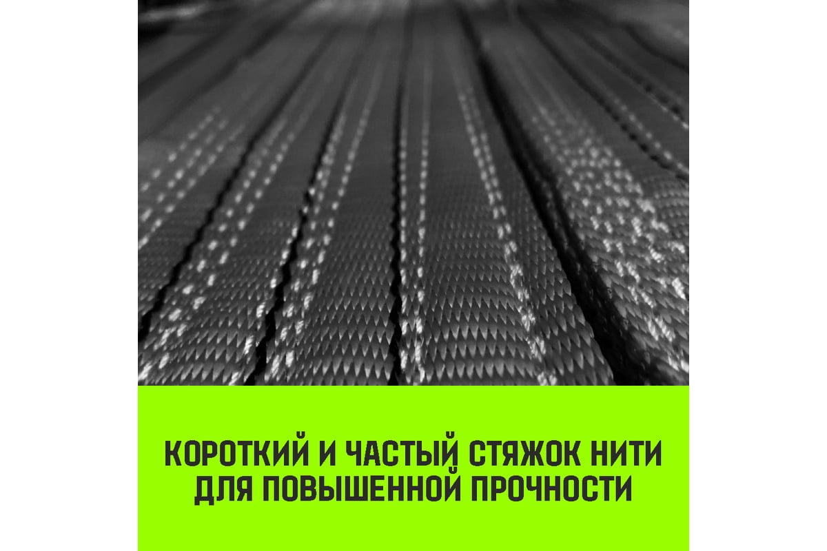Сшивка, как самое слабое место стропа, рассчитана с учетом заявленной нагрузки и длиннее аналогов, представленных на рынке. Так увеличивается надежность оборудования.