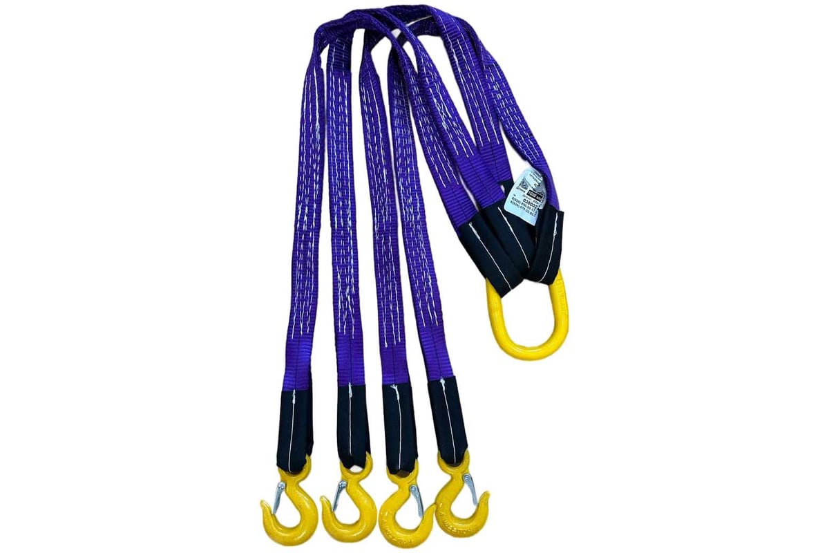 Строп текстильный четырехветвевой 4СТ изготавливается из плоской полиэстеровой ленты с петлевыми окончаниями (огонами) с использованием подъемного звена.