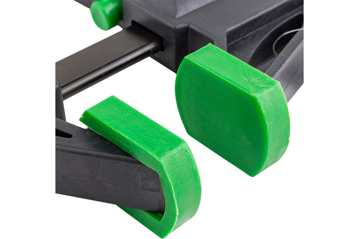 Конструкция струбцины сочетает прочную металлическую шину с надёжными пластиковыми губками — одна из которых подвижная. Это позволяет быстро подстраивать захват под толщину заготовки и фиксировать её одним движением. Инструмент прост в обращении и не требует усилий при установке или снятии.