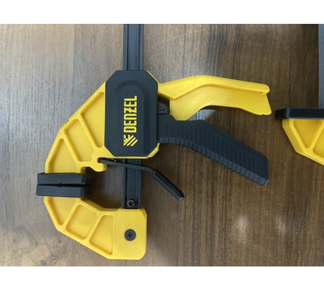 - Комфортное использование — струбцина весит всего 560 г, обрезиненная кнопка фиксации обеспечивает удобный захват
